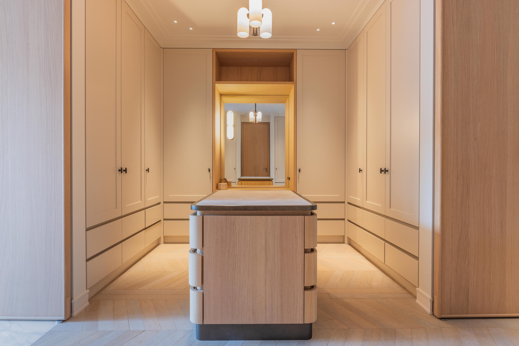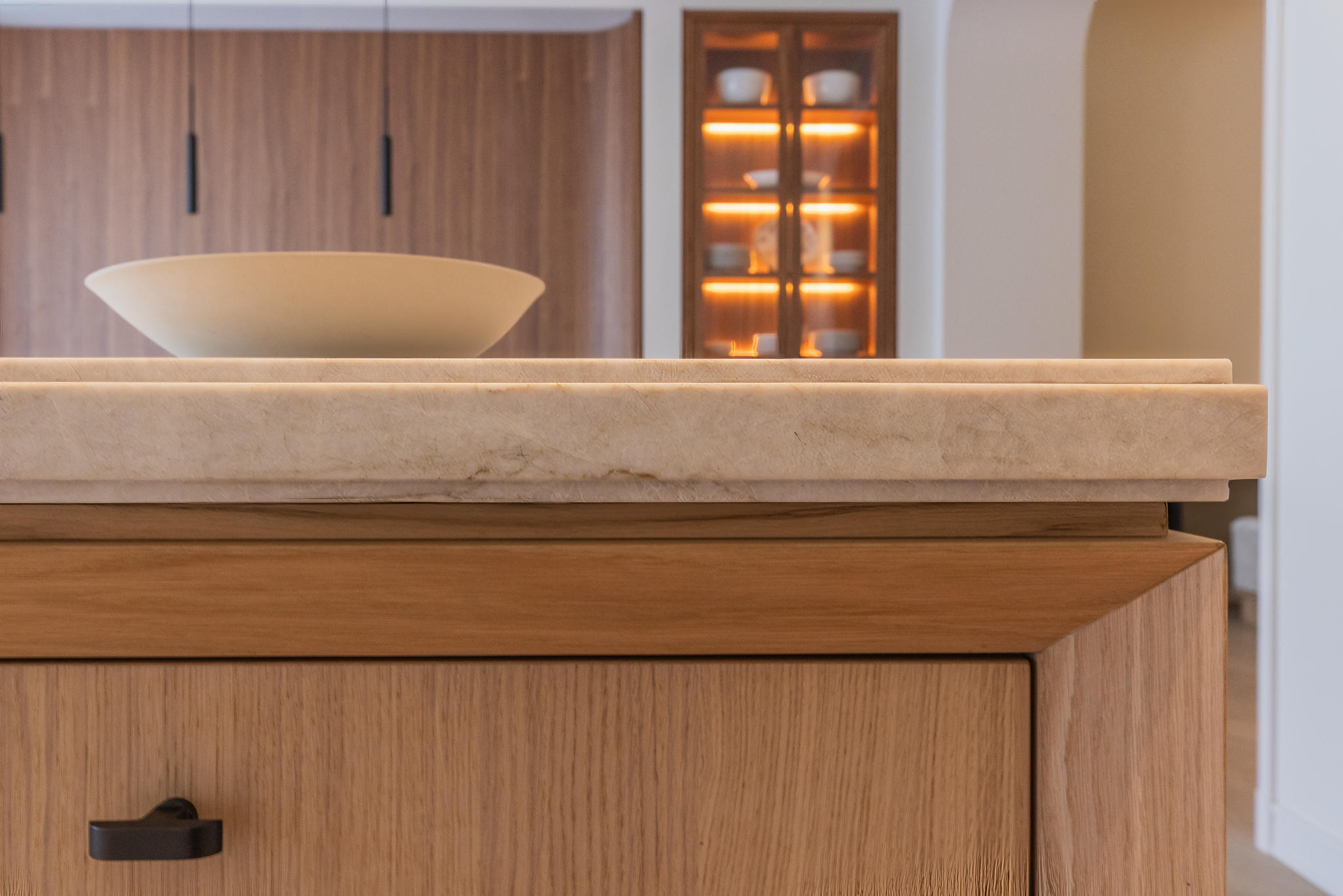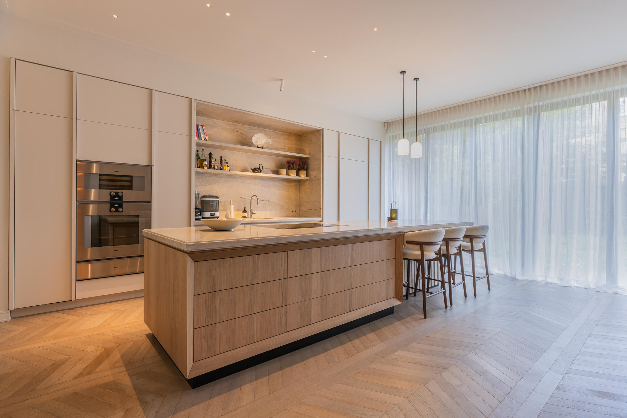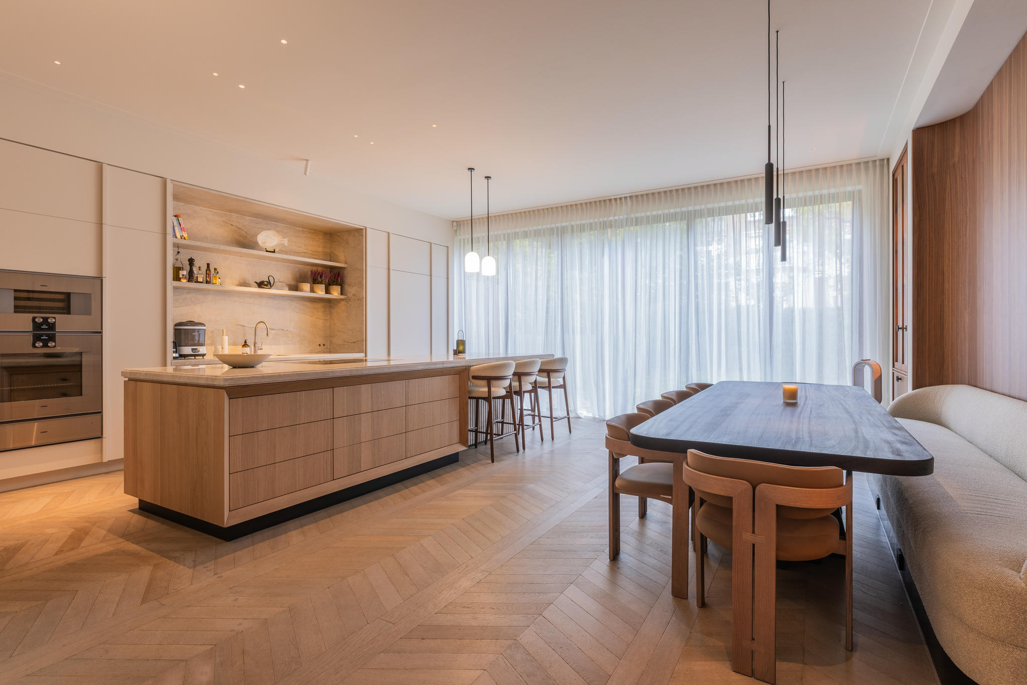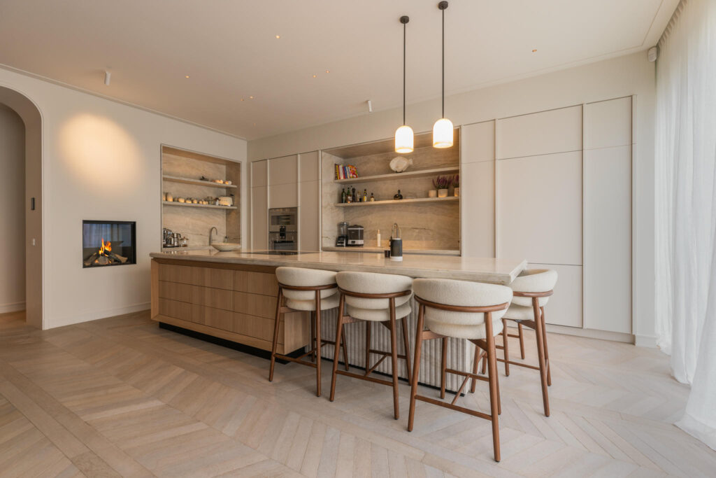 Na een volledige strip tot op de basis werd de woning stap voor stap opnieuw opgebouwd. Elke ruimte werd met zorg en precisie gerealiseerd — van de constructieve werkzaamheden tot de fijnste afbouwwerkzaamheden. Een uitbouw van vier meter diep over de volle breedte van het huis zorgde voor een zee aan licht en ruimte, waardoor een indrukwekkende leefkeuken kon ontstaan: het nieuwe hart van de woning.
