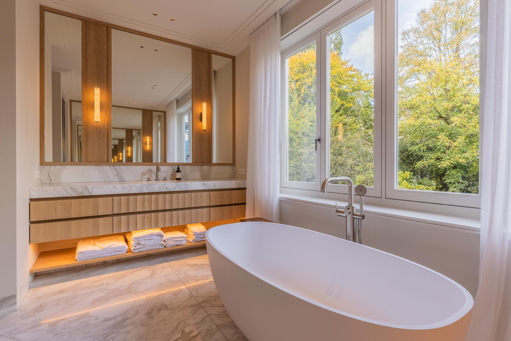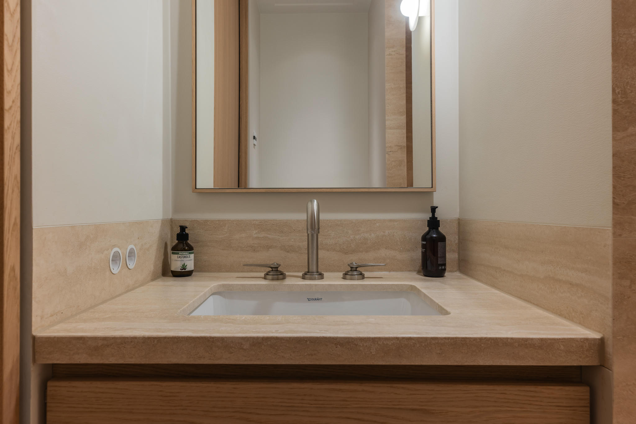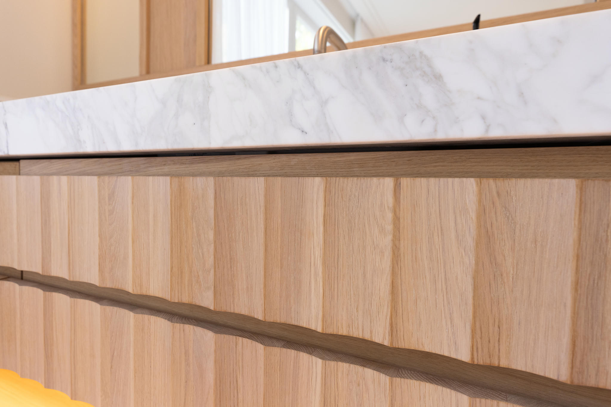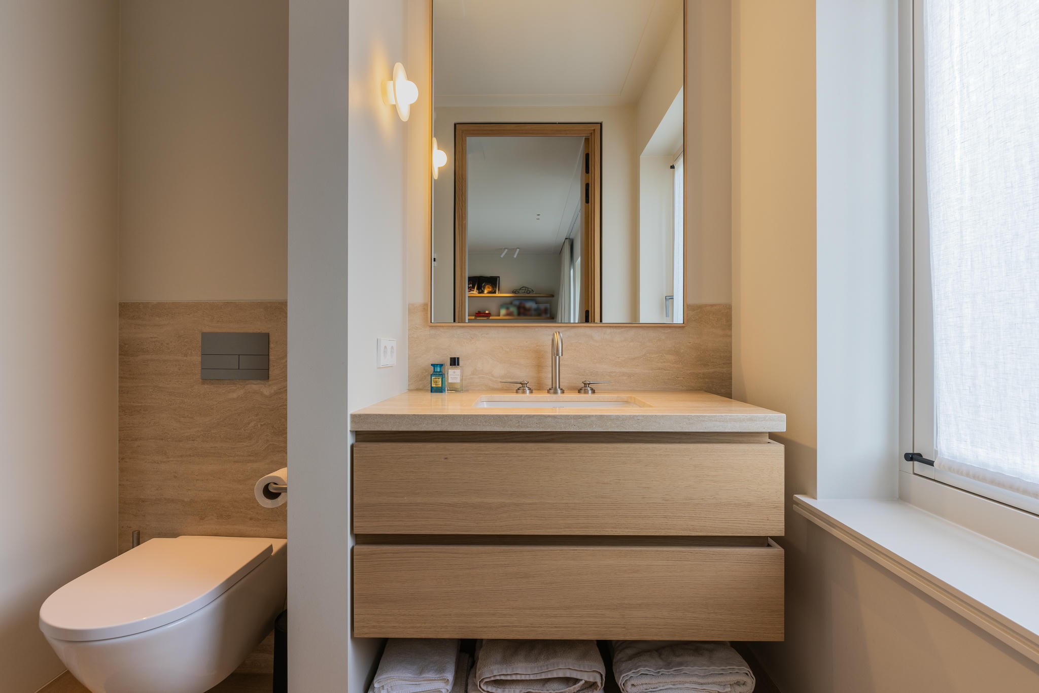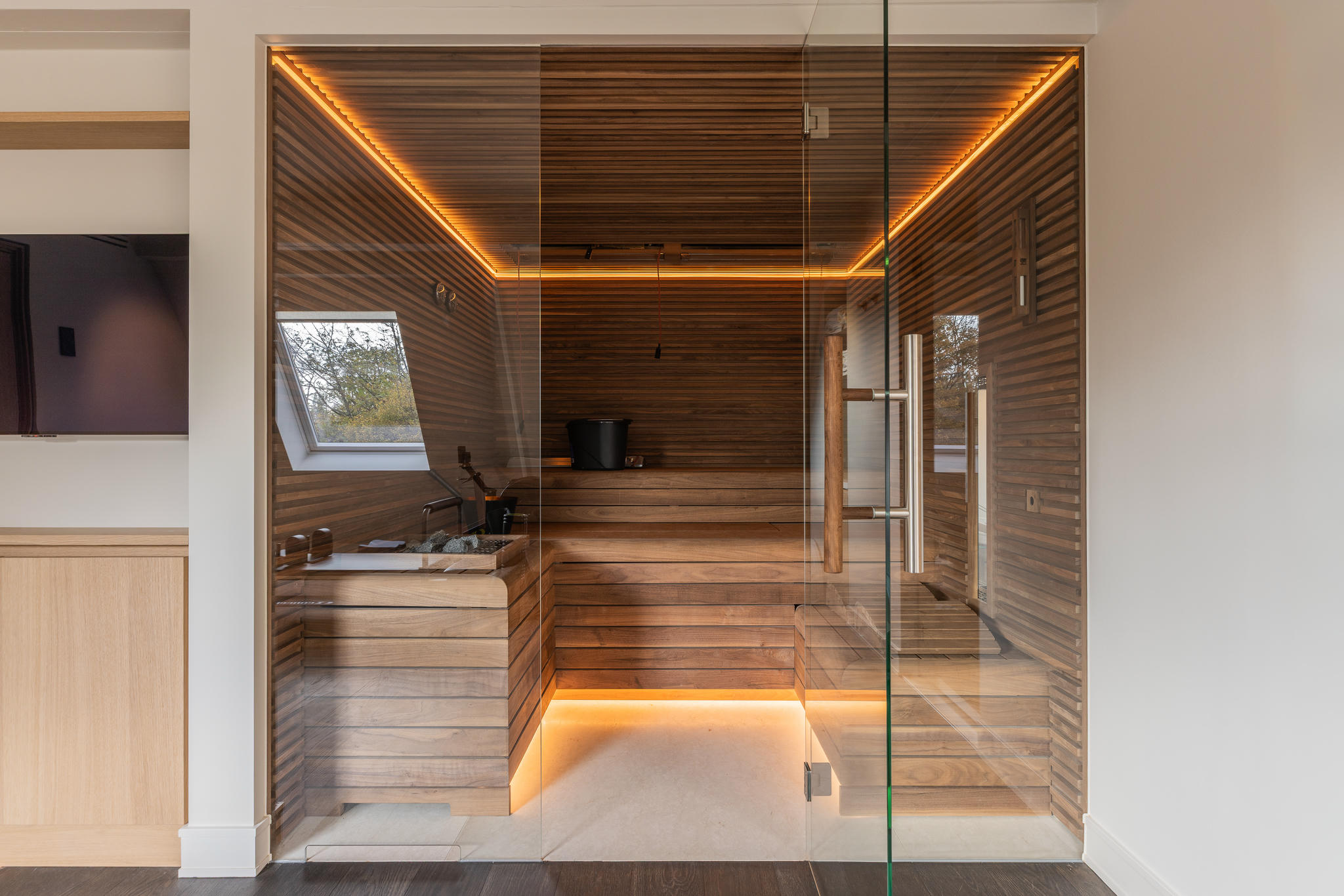 Na een volledige strip tot op de basis werd de woning stap voor stap opnieuw opgebouwd. Elke ruimte werd met zorg en precisie gerealiseerd — van de constructieve werkzaamheden tot de fijnste afbouwwerkzaamheden. Een uitbouw van vier meter diep over de volle breedte van het huis zorgde voor een zee aan licht en ruimte, waardoor een indrukwekkende leefkeuken kon ontstaan: het nieuwe hart van de woning.