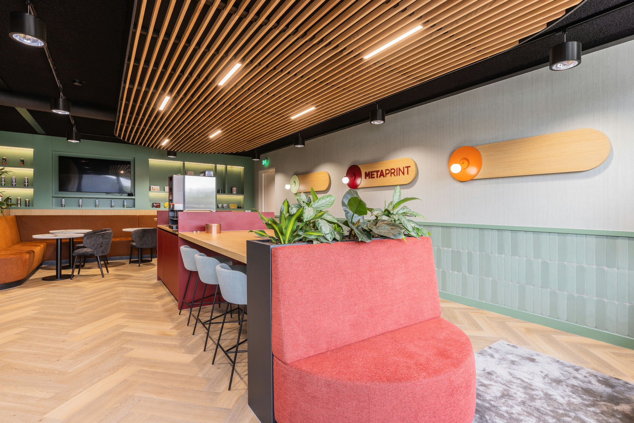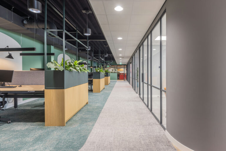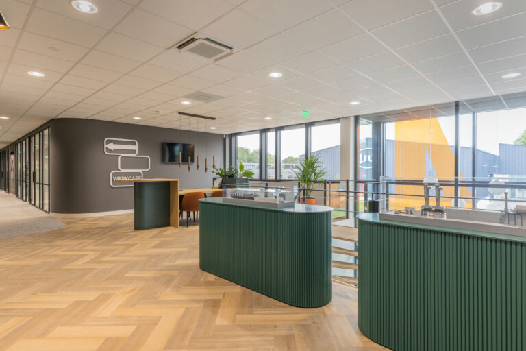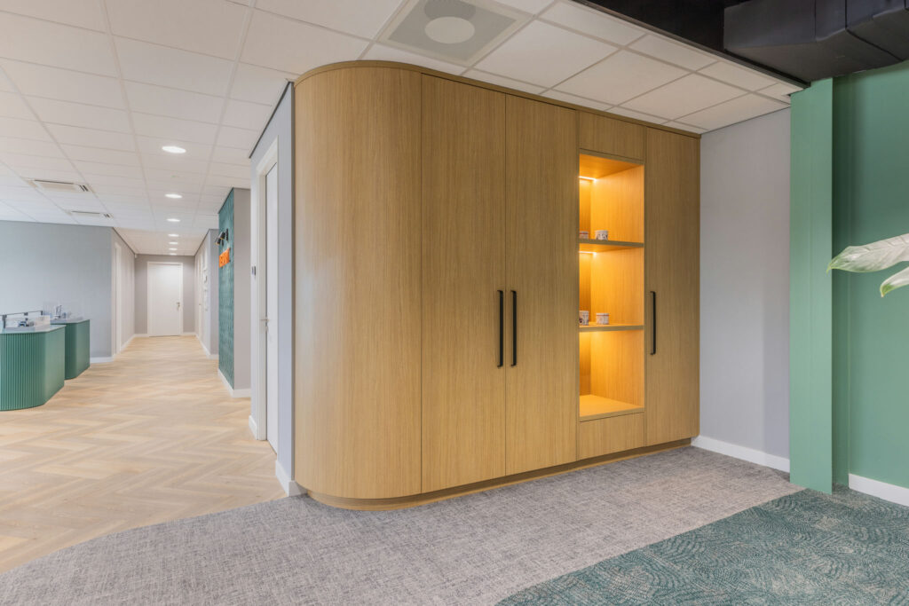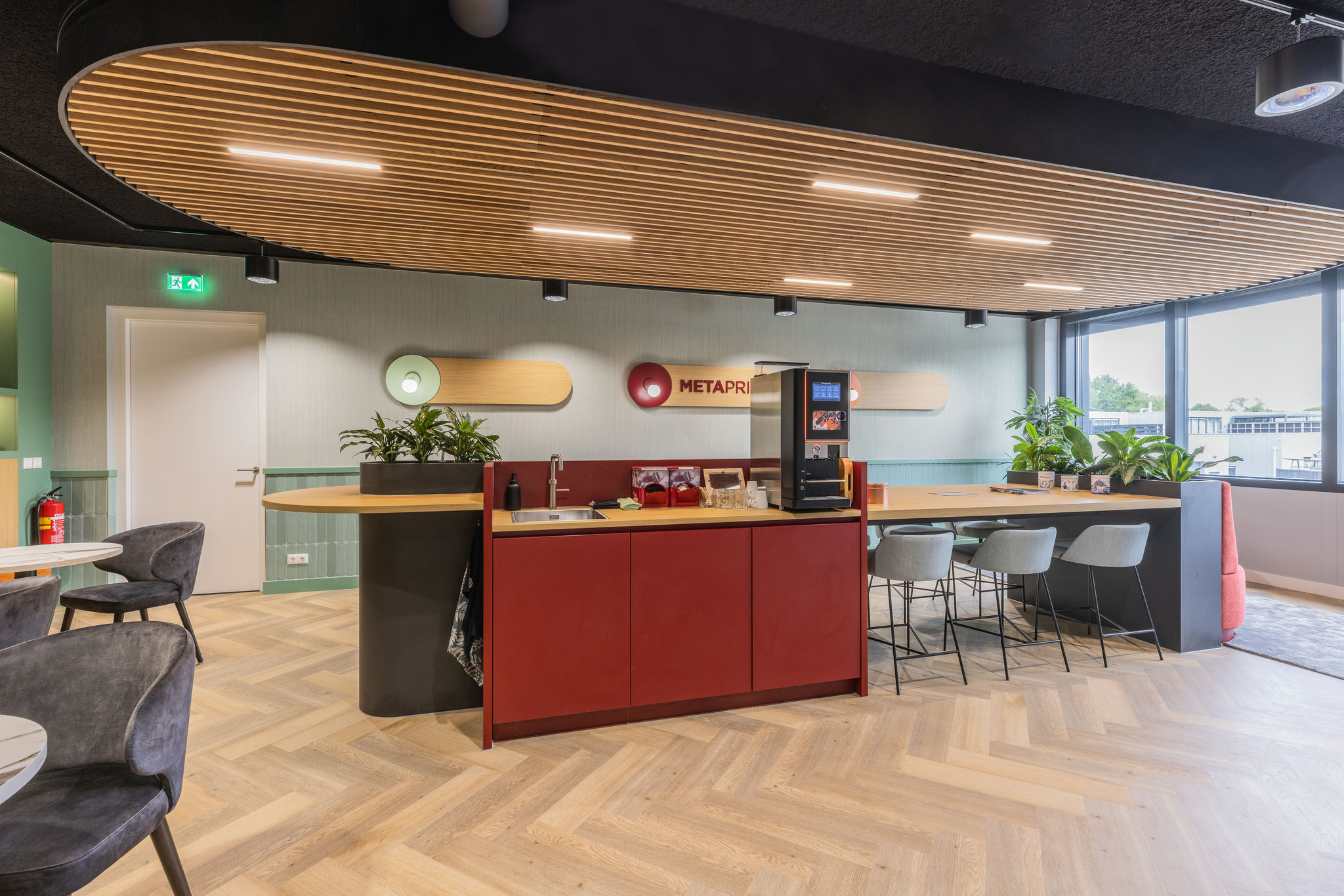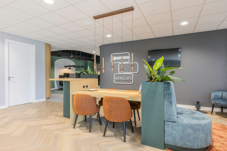 transparant beeld . De aankleding is modern maar ook warm en sfeervol en de kantine met het nodige groen en het mooie houten plafond met afgeronde kanten maakt het geheel af.
