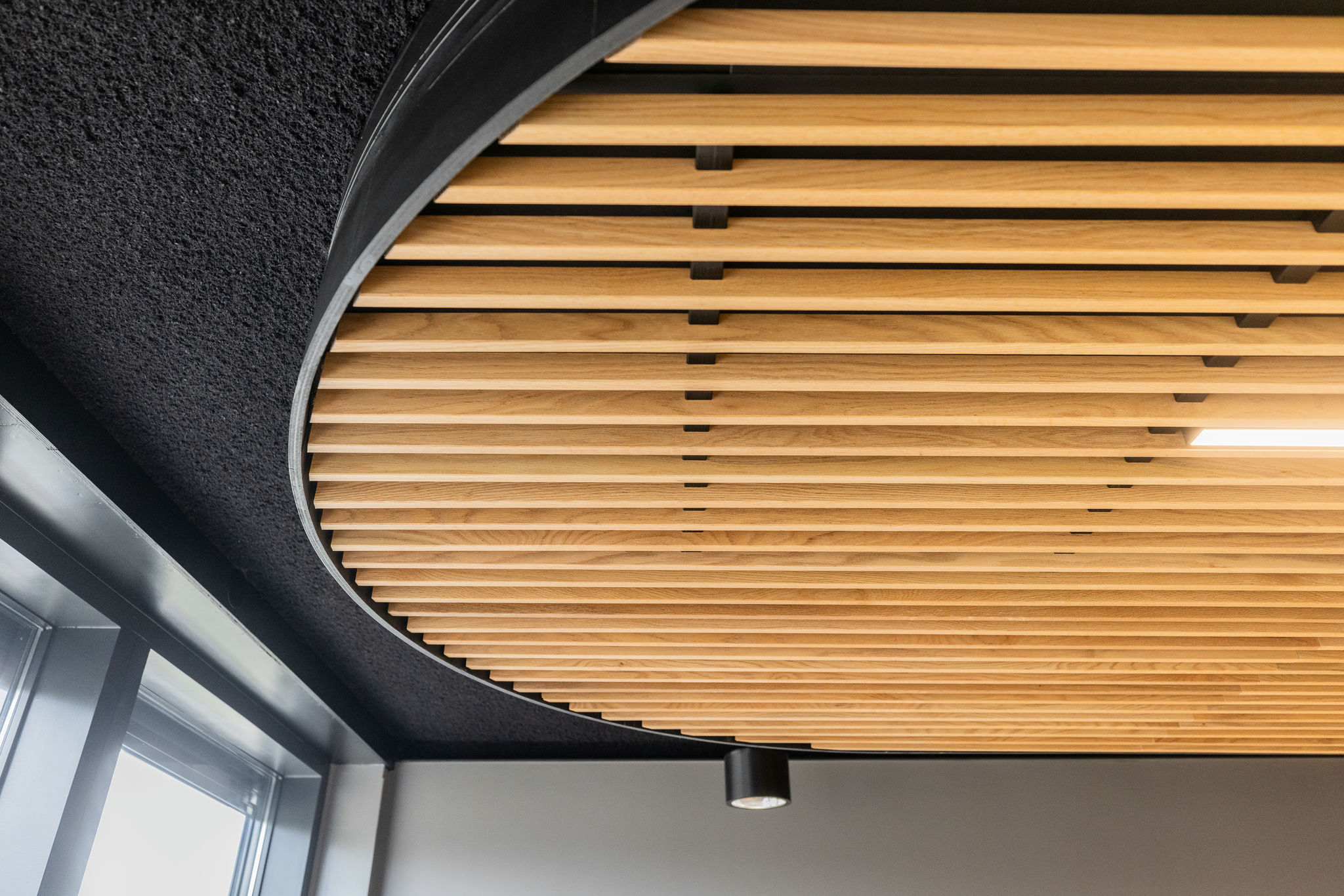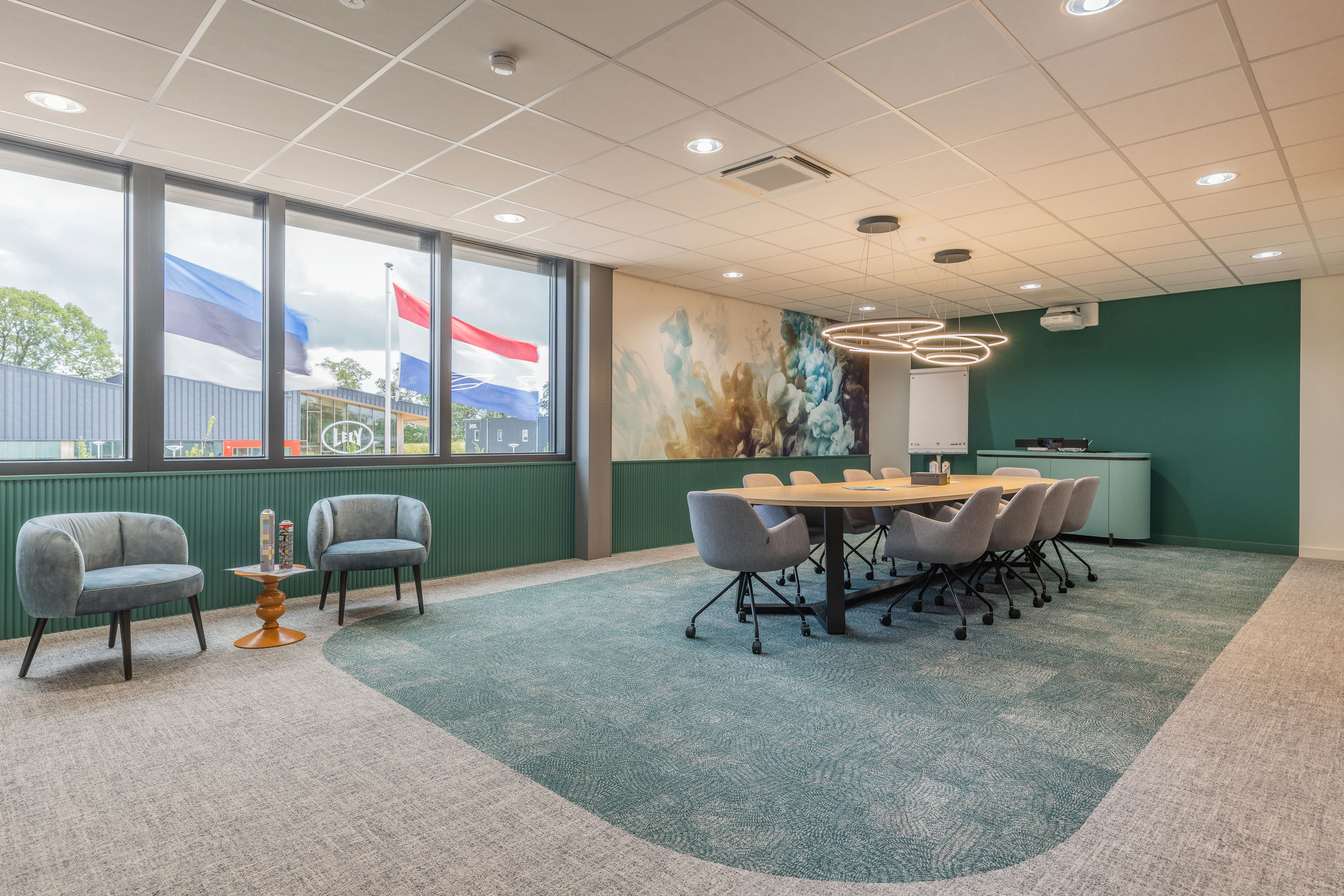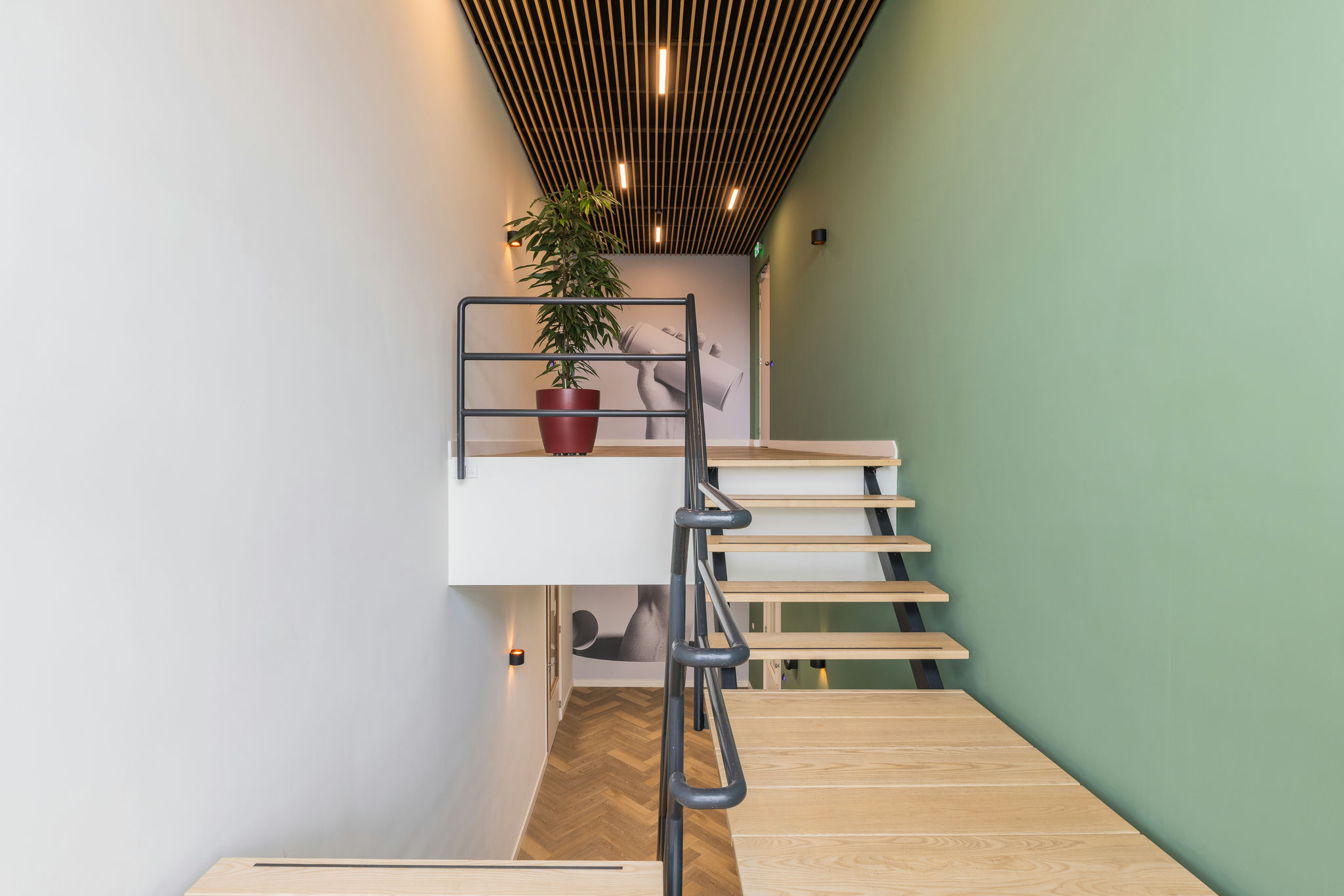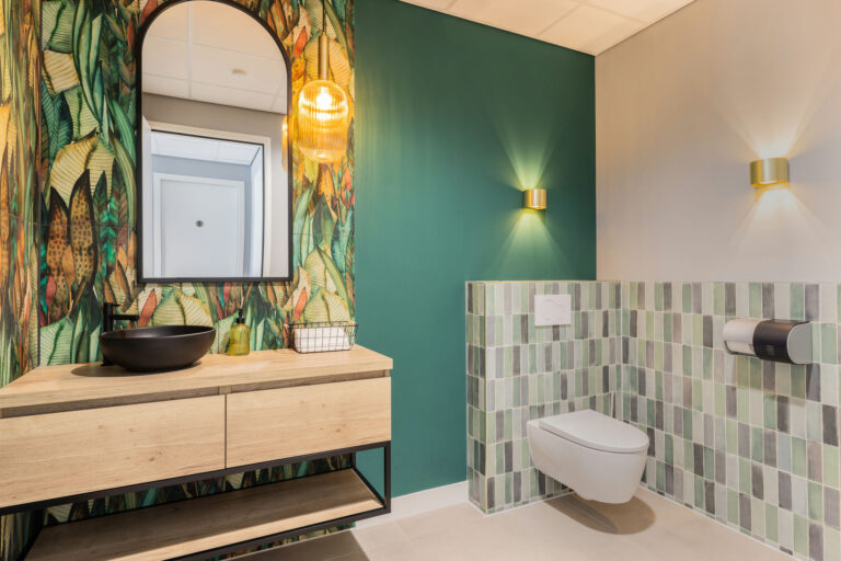 transparant beeld . De aankleding is modern maar ook warm en sfeervol en de kantine met het nodige groen en het mooie houten plafond met afgeronde kanten maakt het geheel af.